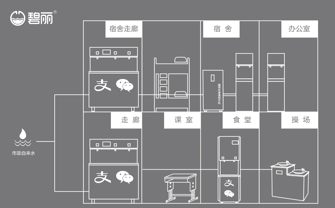 碧麗大型反滲透純水設備將自來水集中處理后,把優(yōu)質的純凈水通過專用的供水管道輸送到各飲水點;