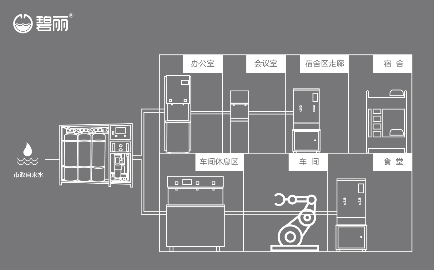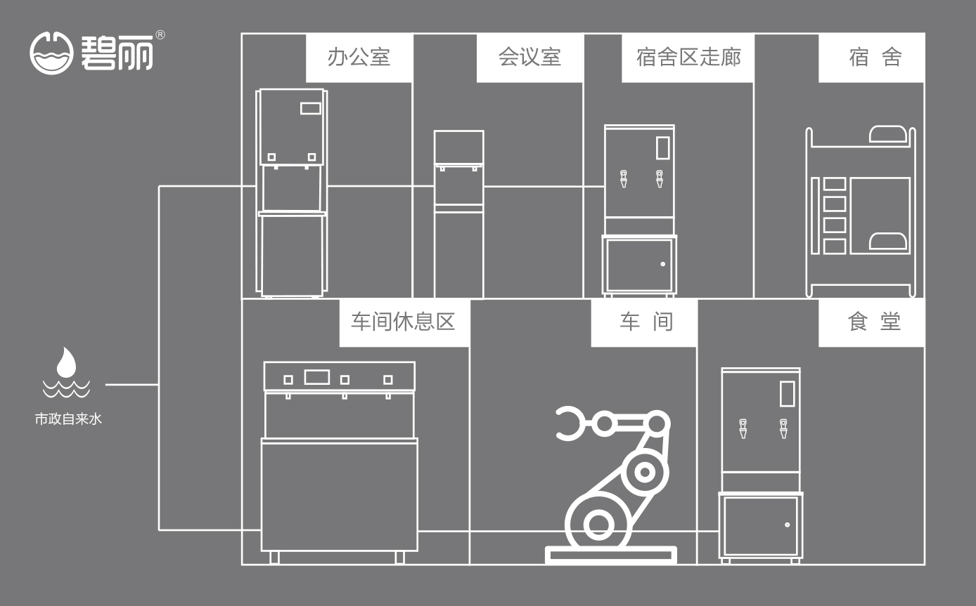 碧麗商用反滲透純水機(jī)將自來水集中處理后,把優(yōu)質(zhì)的純凈水通過專用的供水管道輸送到各飲水點(diǎn);